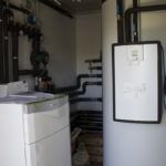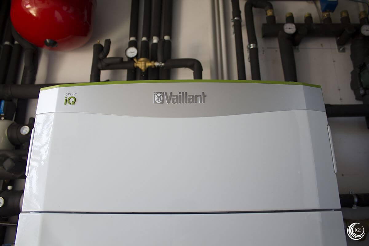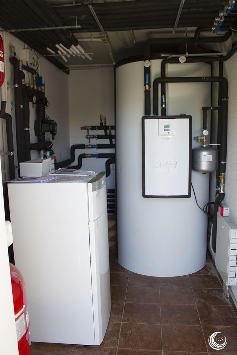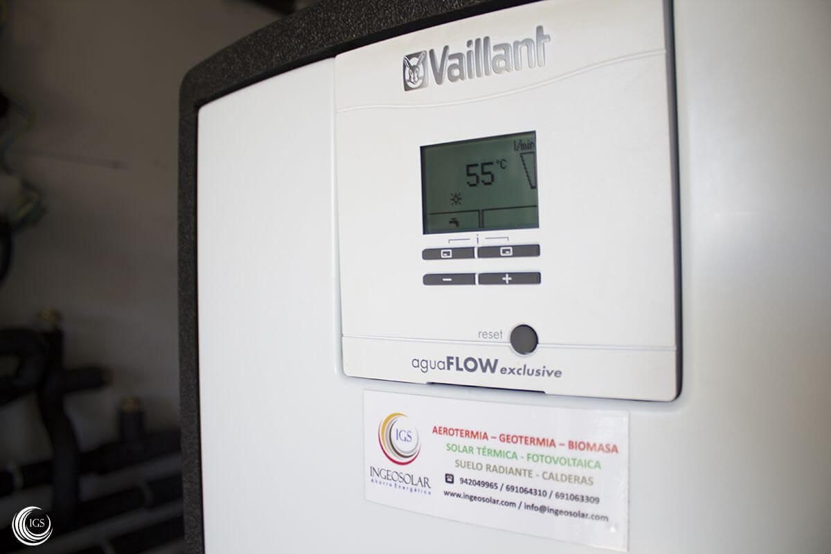 En esta primera fase se ha finalizado la captación de geotermia vertical, la sala técnica y la instalación hidráulica. La sala técnica está formada por una bomba de calor geotérmica de la marca Vaillant modelo flexoTHERM, un acumulador allSTOR de 1000 litros de capacidad y un módulo de producción Vaillant de agua caliente sanitaria aguaFLOW.