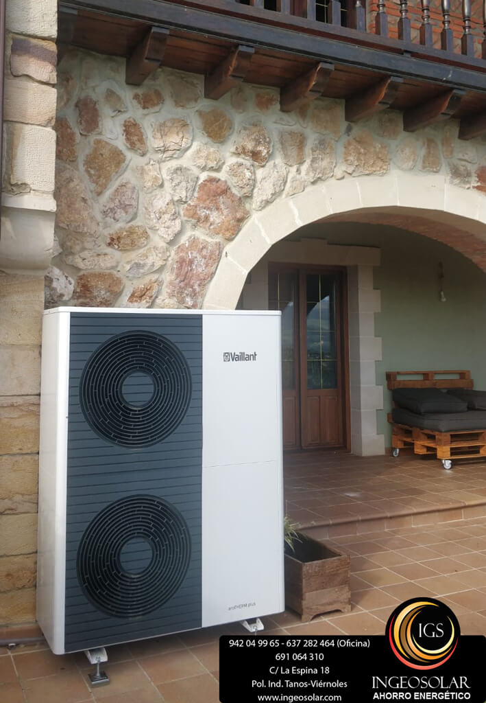 La bomba de calor encargada tanto de la calefacción como del agua caliente sanitaria es la aroTHERM Plus de Vaillant con refrigerante R290. También se ha incluido el módulo VR920 que permite el acceso a la regulación de la bomba de calor vía Wifi.