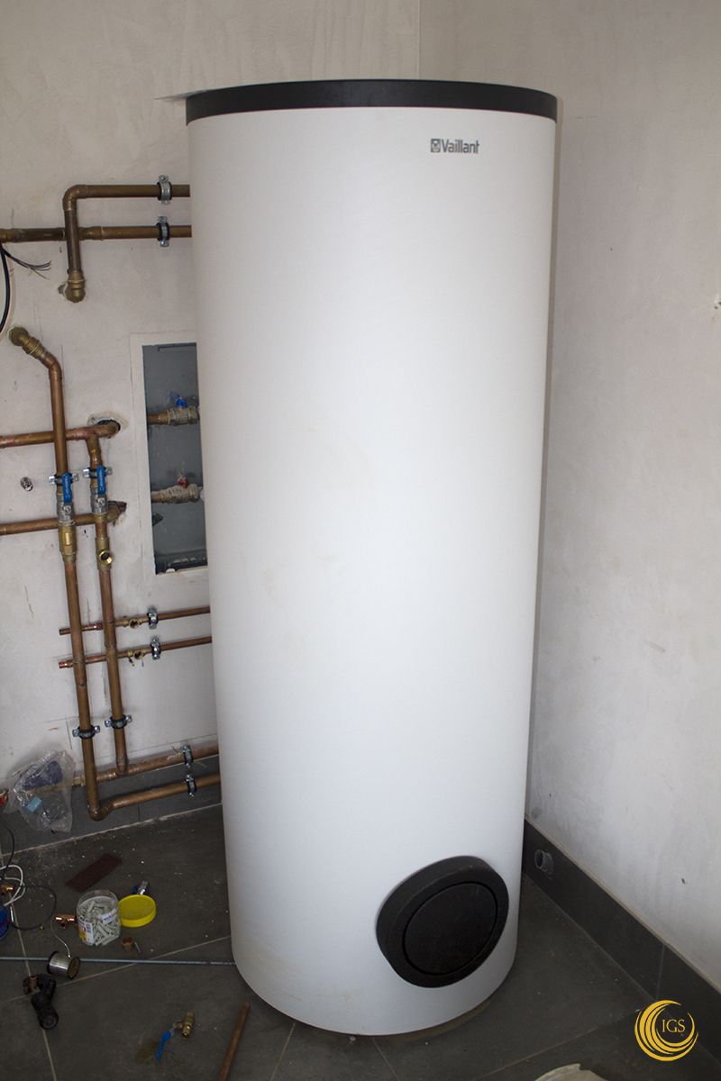 Del mismo modo, el interacumulador es el modelo VIH RW 300 con capacidad de 285 litros con serpentín fijo de 2,9 m2 de superficie de intercambio, también de Vaillant.
